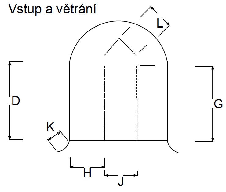 • L – okýnko nad dveřmi, další stejné okénko je standardně i na protilehlé straně plachty. Šíře okýnka je stejná jako šíře dveří – standardně 40 cm na každou stranu.